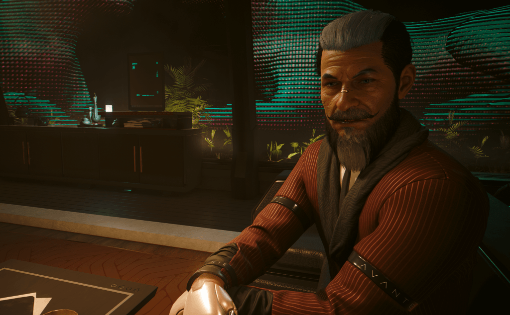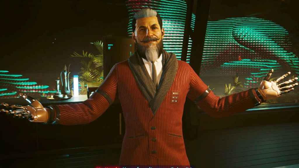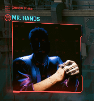 Mr. Hands agrees but only if V does 3 quests for him….so u do 3 quests for him and in return he will give u what u want…..anyways u go and do 3 missions for him then he calls u up telling u to meet him at his hotel room he lives at……and here we finally get to see what the elusive Mr. Hands looks like in the flesh….and I ain’t a fan of his design….let me explain…..so they redesigned his character and they got a different actor to voice him here….